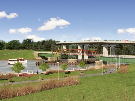 Every day we get closer to the completion of the Swing Bridge that will connect Grays Ferry Crescent and Bartram’s Mile (shown in the above rendering). The contractors installed the center turning mechanism which will allow the truss to rotate open and closed. The truss will soon be delivered to a yard near Fort Mifflin where it will be assembled in three parts and then loaded onto a barge and brought upriver. Once this project is open to the public, we will be able to cross the tidal Schuylkill on a pedestrian- and cyclist-only bridge! And once the Christian to Crescent Connection is completed in a few years (shown in the below rendering), we will be able to walk, run, bike, skate board, and roller blade between dozens of neighborhoods from Kingsessing to Roxborough and beyond on a car-free trail.