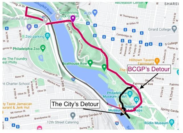 Pedestrians and cyclists can turn off of MLK Jr. Drive (aka West River Drive) to access Schuylkill Banks. Be sure to use the signalized crossing if you need to cross traffic.
